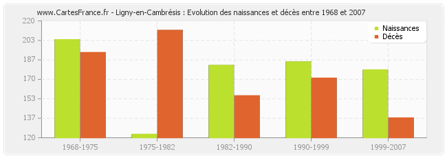 Ligny-en-Cambrésis : évolution des naissances et décès de 1968 à 2007