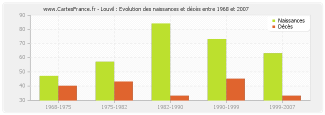 Louvil : évolution des naissances et décès de 1968 à 2007