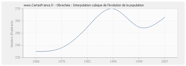 Cette courbe reprend l'historique de la population d'Obrechies de 1968 à 2007 en interpolation cubique. Ceci permet d'obtenir plus précisément la population de la commune d'Obrechies les années ou aucun recensement n'a été effectué.