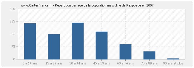 - Hommes de 0 à 14 ans habitant Rexpoëde : 213