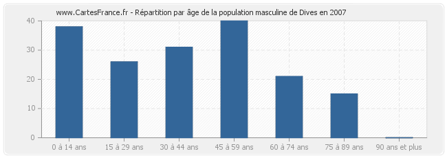 - Hommes de 0 à 14 ans habitant Dives : 38