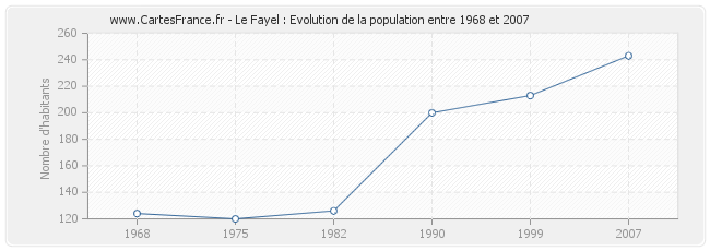La population de Le Fayel était de 243 habitants en 2007, 213 habitants en 1999, 200 habitants en 1990, 126 habitants en 1982, 120 habitants en 1975 et 124 habitants en 1968.