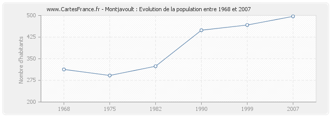 Cette courbe reprend l'historique de la population de Montjavoult de 1968 à 2007 en interpolation cubique. Ceci permet d'obtenir plus précisément la population de la commune de Montjavoult les années ou aucun recensement n'a été effectué.