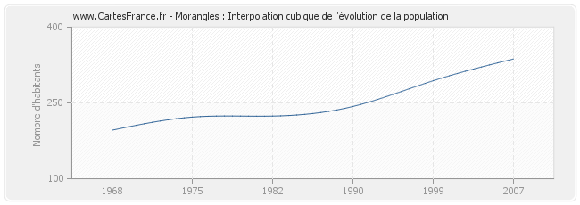 Cette courbe reprend l'historique de la population de Morangles de 1968 à 2007 en interpolation cubique. Ceci permet d'obtenir plus précisément la population de la commune de Morangles les années ou aucun recensement n'a été effectué.
