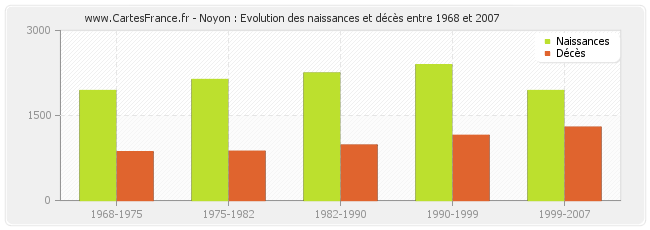 Noyon : évolution des naissances et décès de 1968 à 2007