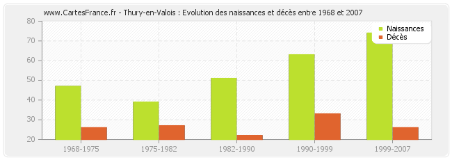 Thury-en-Valois : évolution des naissances et décès de 1968 à 2007