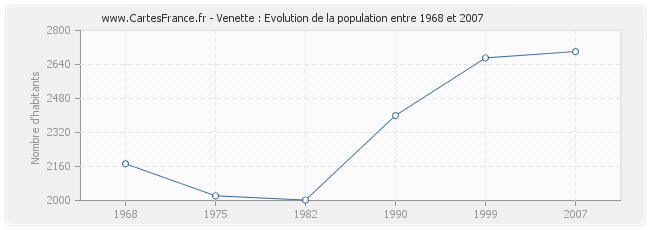 Cette courbe reprend l'historique de la population de Venette de 1968 à 2007 en interpolation cubique. Ceci permet d'obtenir plus précisément la population de la commune de Venette les années ou aucun recensement n'a été effectué.