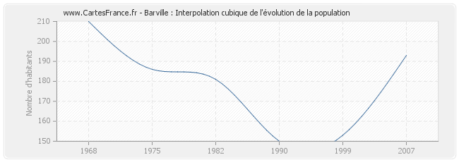 Cette courbe reprend l'historique de la population de Barville de 1968 à 2007 en interpolation cubique. Ceci permet d'obtenir plus précisément la population de la commune de Barville les années ou aucun recensement n'a été effectué.