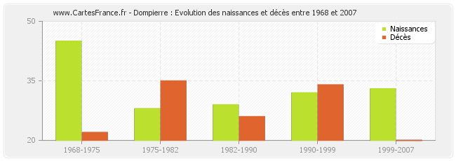 Dompierre : évolution des naissances et décès de 1968 à 2007