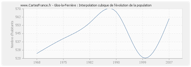 Cette courbe reprend l'historique de la population de Glos-la-Ferrière de 1968 à 2007 en interpolation cubique. Ceci permet d'obtenir plus précisément la population de la commune de Glos-la-Ferrière les années ou aucun recensement n'a été effectué.