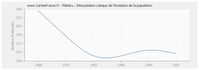Cette courbe reprend l'historique de la population de Mahéru de 1968 à 2007 en interpolation cubique. Ceci permet d'obtenir plus précisément la population de la commune de Mahéru les années ou aucun recensement n'a été effectué.