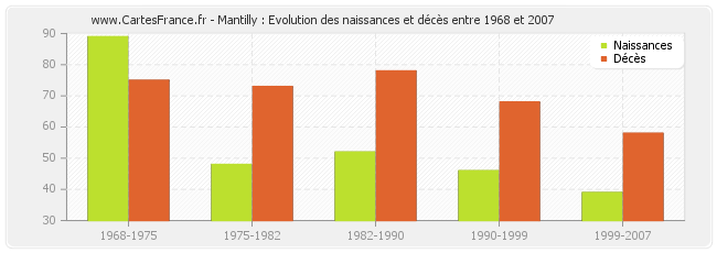 Mantilly : évolution des naissances et décès de 1968 à 2007