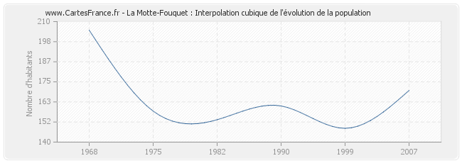 Cette courbe reprend l'historique de la population de La Motte-Fouquet de 1968 à 2007 en interpolation cubique. Ceci permet d'obtenir plus précisément la population de la commune de La Motte-Fouquet les années ou aucun recensement n'a été effectué.