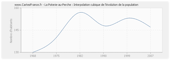 Cette courbe reprend l'historique de la population de La Poterie-au-Perche de 1968 à 2007 en interpolation cubique. Ceci permet d'obtenir plus précisément la population de la commune de La Poterie-au-Perche les années ou aucun recensement n'a été effectué.