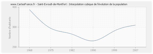 Cette courbe reprend l'historique de la population de Saint-Evroult-de-Montfort de 1968 à 2007 en interpolation cubique. Ceci permet d'obtenir plus précisément la population de la commune de Saint-Evroult-de-Montfort les années ou aucun recensement n'a été effectué.