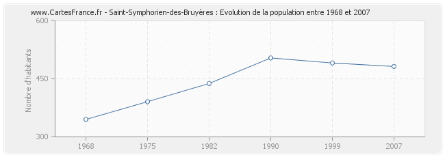 La population de Saint-Symphorien-des-Bruyères était de 482 habitants en 2007, 491 habitants en 1999, 504 habitants en 1990, 438 habitants en 1982, 391 habitants en 1975 et 345 habitants en 1968.