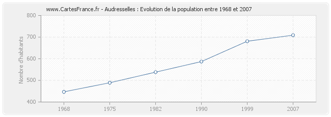 Cette courbe reprend l'historique de la population d'Audresselles de 1968 à 2007 en interpolation cubique. Ceci permet d'obtenir plus précisément la population de la commune d'Audresselles les années ou aucun recensement n'a été effectué.