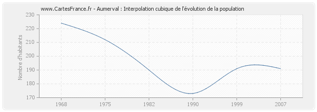 Cette courbe reprend l'historique de la population d'Aumerval de 1968 à 2007 en interpolation cubique. Ceci permet d'obtenir plus précisément la population de la commune d'Aumerval les années ou aucun recensement n'a été effectué.