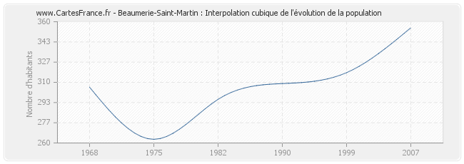 Cette courbe reprend l'historique de la population de Beaumerie-Saint-Martin de 1968 à 2007 en interpolation cubique. Ceci permet d'obtenir plus précisément la population de la commune de Beaumerie-Saint-Martin les années ou aucun recensement n'a été effectué.
