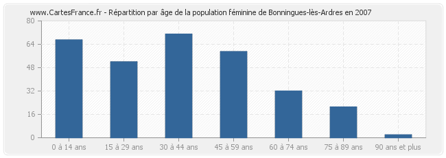 Répartition de la population féminine de Bonningues-lès-Ardres par âge en 2007 :