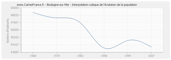 Cette courbe reprend l'historique de la population de Boulogne-sur-Mer de 1968 à 2007 en interpolation cubique. Ceci permet d'obtenir plus précisément la population de la commune de Boulogne-sur-Mer les années ou aucun recensement n'a été effectué.
