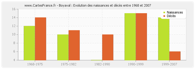 Boyaval : évolution des naissances et décès de 1968 à 2007