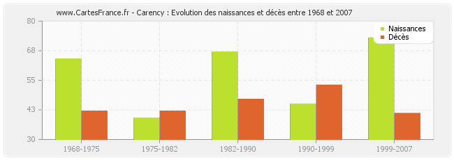 Carency : évolution des naissances et décès de 1968 à 2007