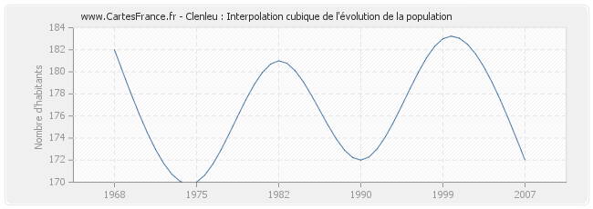 Cette courbe reprend l'historique de la population de Clenleu de 1968 à 2007 en interpolation cubique. Ceci permet d'obtenir plus précisément la population de la commune de Clenleu les années ou aucun recensement n'a été effectué.