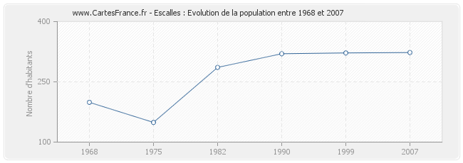 Cette courbe reprend l'historique de la population d'Escalles de 1968 à 2007 en interpolation cubique. Ceci permet d'obtenir plus précisément la population de la commune d'Escalles les années ou aucun recensement n'a été effectué.