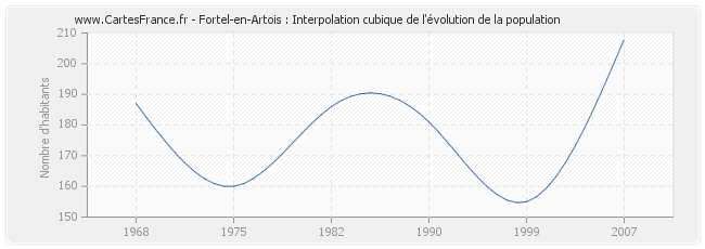 Cette courbe reprend l'historique de la population de Fortel-en-Artois de 1968 à 2007 en interpolation cubique. Ceci permet d'obtenir plus précisément la population de la commune de Fortel-en-Artois les années ou aucun recensement n'a été effectué.