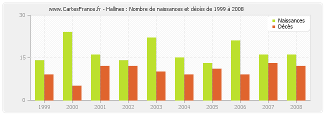 Hallines : évolution des naissances et décès de 1968 à 2007