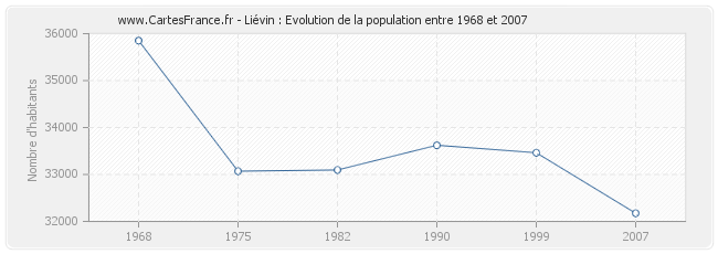 La population de Liévin était de 32 174 habitants en 2007, 33 463 habitants en 1999, 33 623 habitants en 1990, 33 096 habitants en 1982, 33 070 habitants en 1975 et 35 853 habitants en 1968.