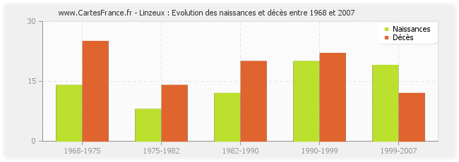 Linzeux : évolution des naissances et décès de 1968 à 2007
