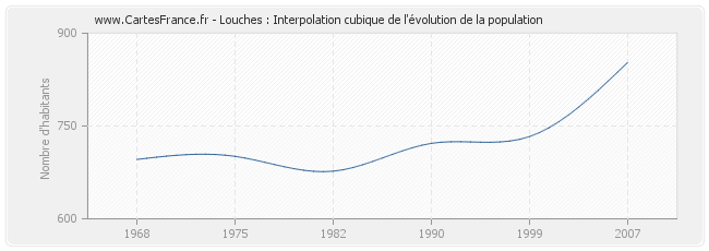 Cette courbe reprend l'historique de la population de Louches de 1968 à 2007 en interpolation cubique. Ceci permet d'obtenir plus précisément la population de la commune de Louches les années ou aucun recensement n'a été effectué.