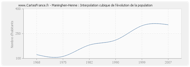 Cette courbe reprend l'historique de la population de Maninghen-Henne de 1968 à 2007 en interpolation cubique. Ceci permet d'obtenir plus précisément la population de la commune de Maninghen-Henne les années ou aucun recensement n'a été effectué.