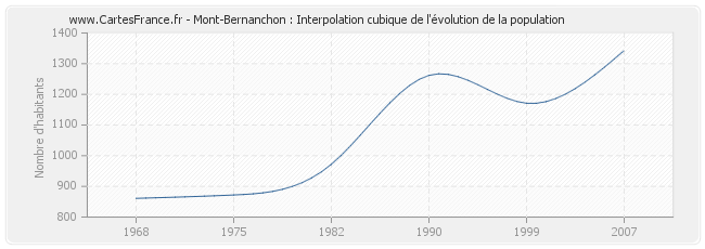 Cette courbe reprend l'historique de la population de Mont-Bernanchon de 1968 à 2007 en interpolation cubique. Ceci permet d'obtenir plus précisément la population de la commune de Mont-Bernanchon les années ou aucun recensement n'a été effectué.