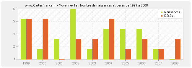 - Moyenneville en 2008 : 1 naissances et 3 décès