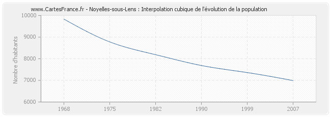 Cette courbe reprend l'historique de la population de Noyelles-sous-Lens de 1968 à 2007 en interpolation cubique. Ceci permet d'obtenir plus précisément la population de la commune de Noyelles-sous-Lens les années ou aucun recensement n'a été effectué.