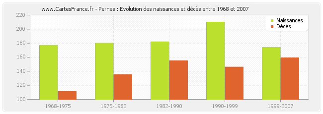 Pernes : évolution des naissances et décès de 1968 à 2007