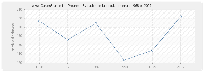 La population de Preures était de 524 habitants en 2007, 448 habitants en 1999, 426 habitants en 1990, 509 habitants en 1982, 472 habitants en 1975 et 514 habitants en 1968.