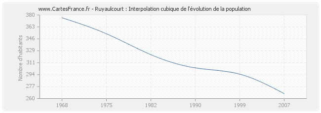 Cette courbe reprend l'historique de la population de Ruyaulcourt de 1968 à 2007 en interpolation cubique. Ceci permet d'obtenir plus précisément la population de la commune de Ruyaulcourt les années ou aucun recensement n'a été effectué.
