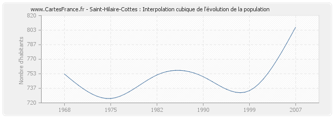 Cette courbe reprend l'historique de la population de Saint-Hilaire-Cottes de 1968 à 2007 en interpolation cubique. Ceci permet d'obtenir plus précisément la population de la commune de Saint-Hilaire-Cottes les années ou aucun recensement n'a été effectué.