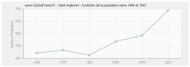 Cette courbe reprend l'historique de la population de Saint-Inglevert de 1968 à 2007 en interpolation cubique. Ceci permet d'obtenir plus précisément la population de la commune de Saint-Inglevert les années ou aucun recensement n'a été effectué.