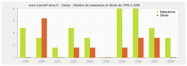 Sempy : évolution des naissances et décès de 1968 à 2007