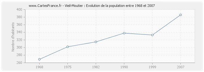 La population de Vieil-Moutier était de 386 habitants en 2007, 333 habitants en 1999, 338 habitants en 1990, 315 habitants en 1982, 302 habitants en 1975 et 269 habitants en 1968.