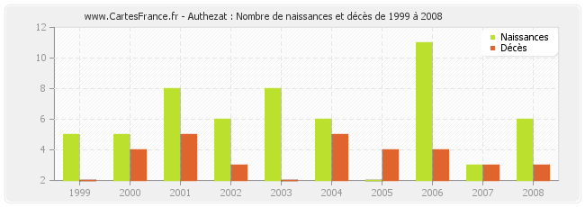Authezat : évolution des naissances et décès de 1968 à 2007