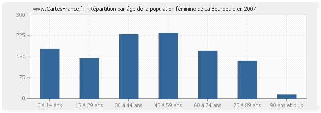Répartition de la population féminine de La Bourboule par âge en 2007 :