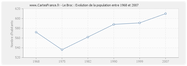 La population de Le Broc était de 610 habitants en 2007, 591 habitants en 1999, 588 habitants en 1990, 562 habitants en 1982, 536 habitants en 1975 et 572 habitants en 1968.
