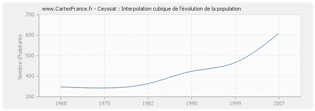 Cette courbe reprend l'historique de la population de Ceyssat de 1968 à 2007 en interpolation cubique. Ceci permet d'obtenir plus précisément la population de la commune de Ceyssat les années ou aucun recensement n'a été effectué.