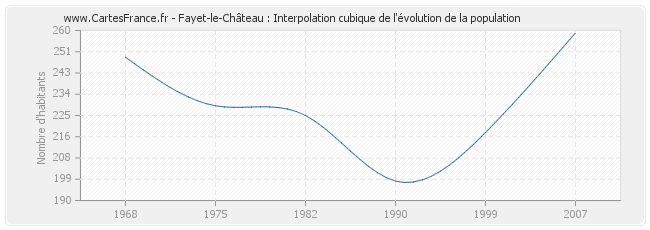 Cette courbe reprend l'historique de la population de Fayet-le-Château de 1968 à 2007 en interpolation cubique. Ceci permet d'obtenir plus précisément la population de la commune de Fayet-le-Château les années ou aucun recensement n'a été effectué.